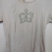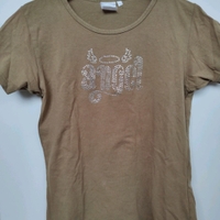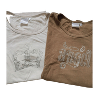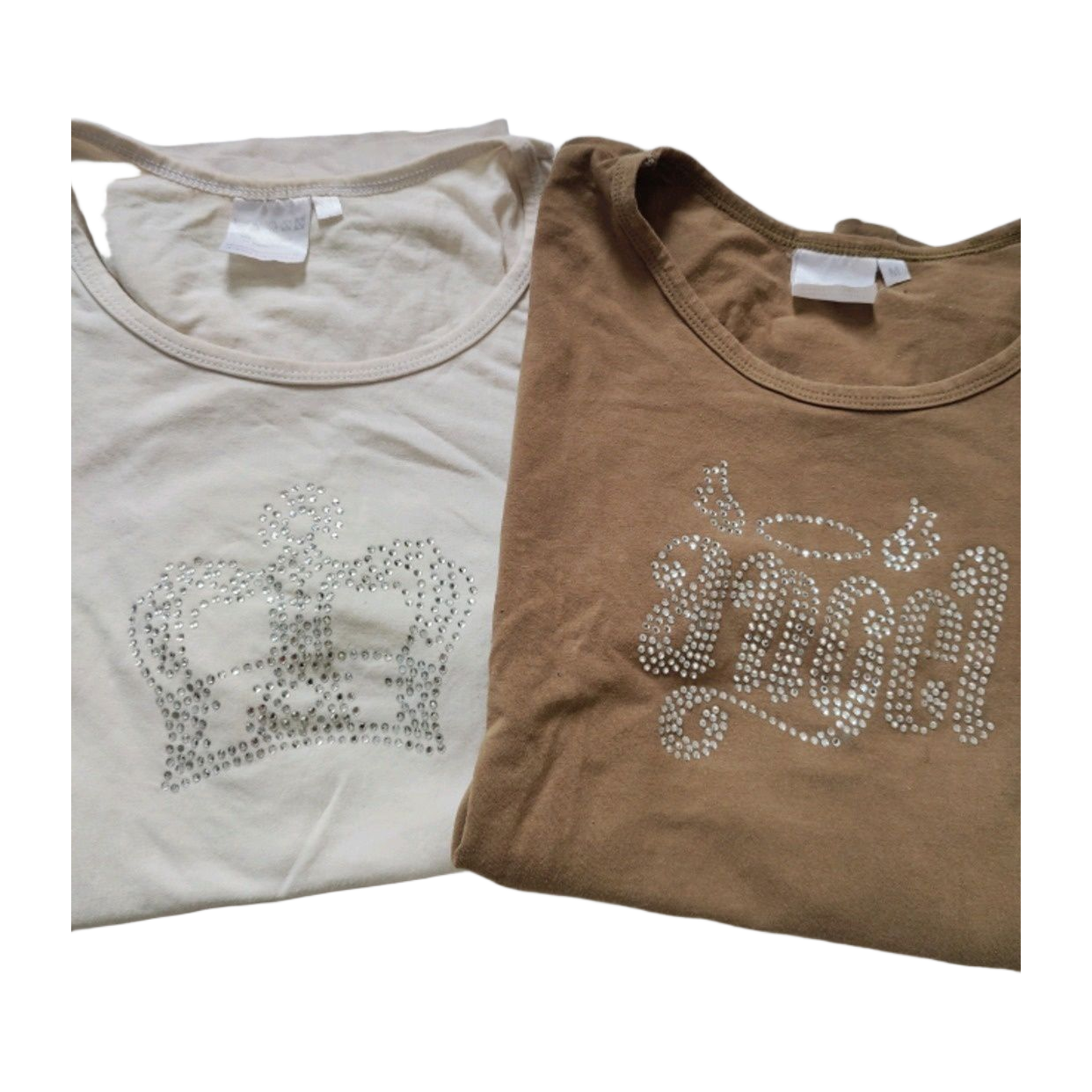 Kaksi t-paitaa, valkoisessa paidassa strassikruunu ja vihreässä teksti angel. Valmistuttaja Intrade Partners