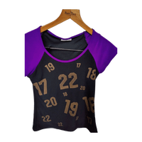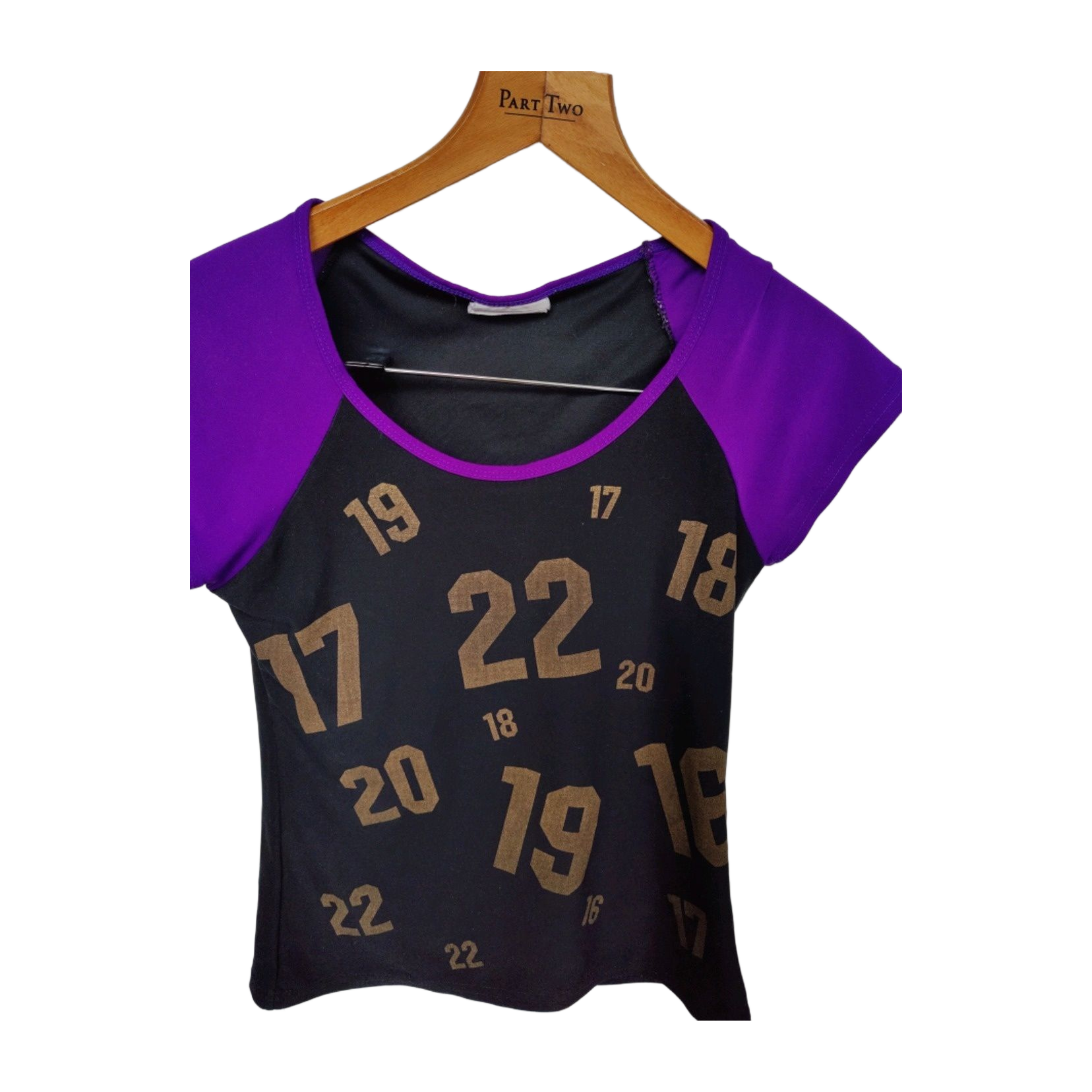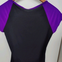 Toppi sekä paita, hihaton toppi, jossa vesiputous kaulus ja musta lilahihainen paita, jossa edessä numerot. Väri on tumma lila, kuvassa näyttää kirkkaammalta. Topissa ei ole kokomerkintä eikä materiaalia näkyvissä. Paita on Catch - One clothig - merkkinen ja koko S/M. Toppi vastaa myös kokoa S/M.