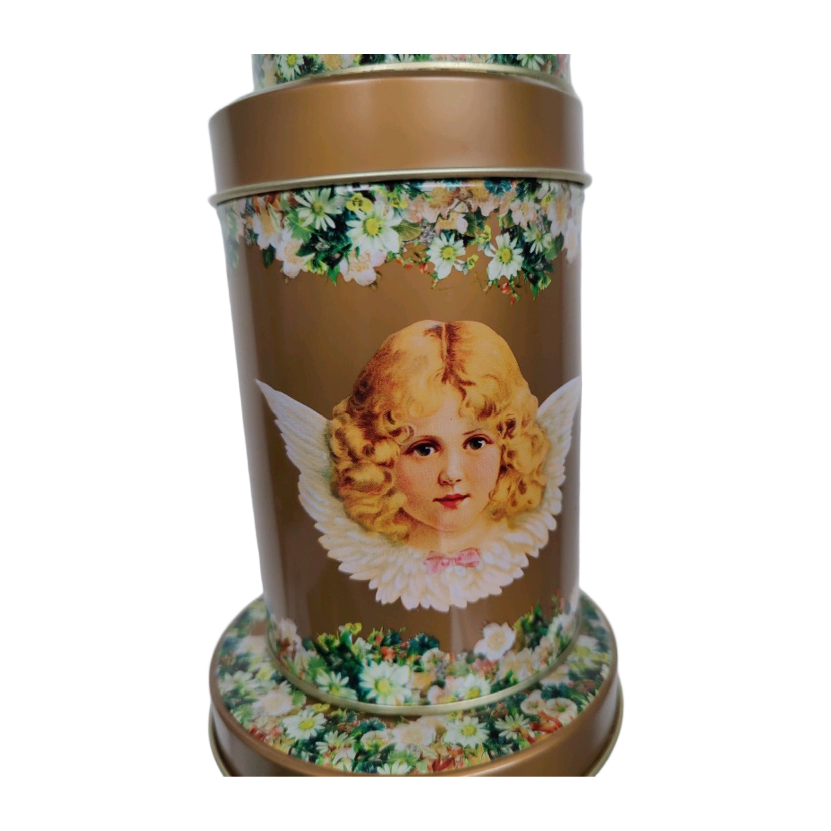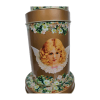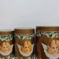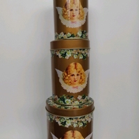 Metallipurkit enkelikuvilla, 3 kpl, isoimman korkeus 14 cm halkaisija 10,5 cm, 13 cm ja halkaisija 8,5 cm ja pienin 12 cm korkea ja 7,5 halkaisija.