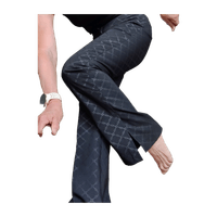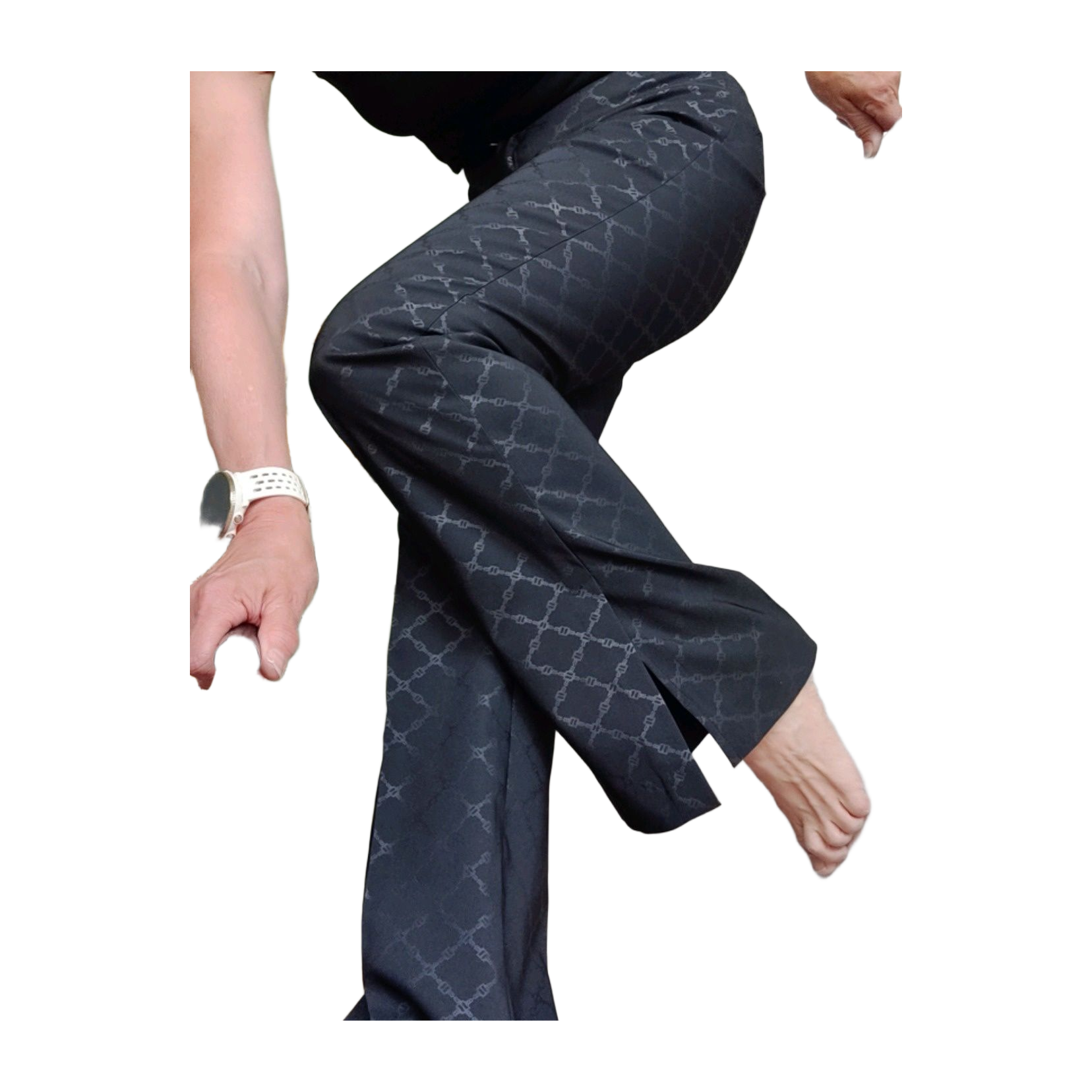 Mustat satiinipintaiset/ kuviolliset housut, halkiot lahkeissa. Leveä vyötärökaitale. Koko 32 on reilu. Vyötärön ympärys noin 66 cm.