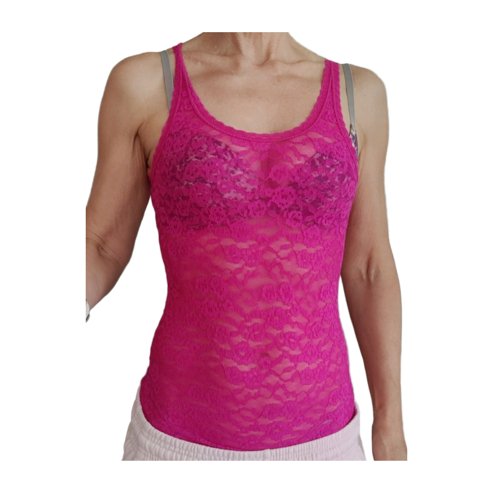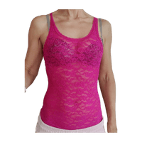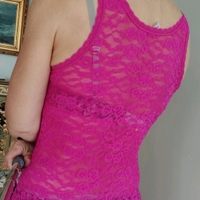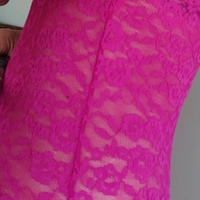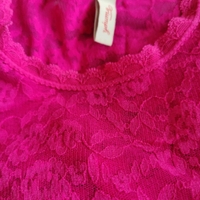 Pinkki pitsinen toppi, pitsinauha pääntiessä ja hihansuissa.