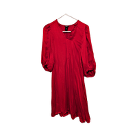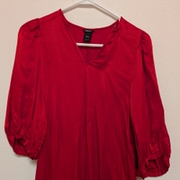 Elegant dress with puff sleeves and a V-neckline.