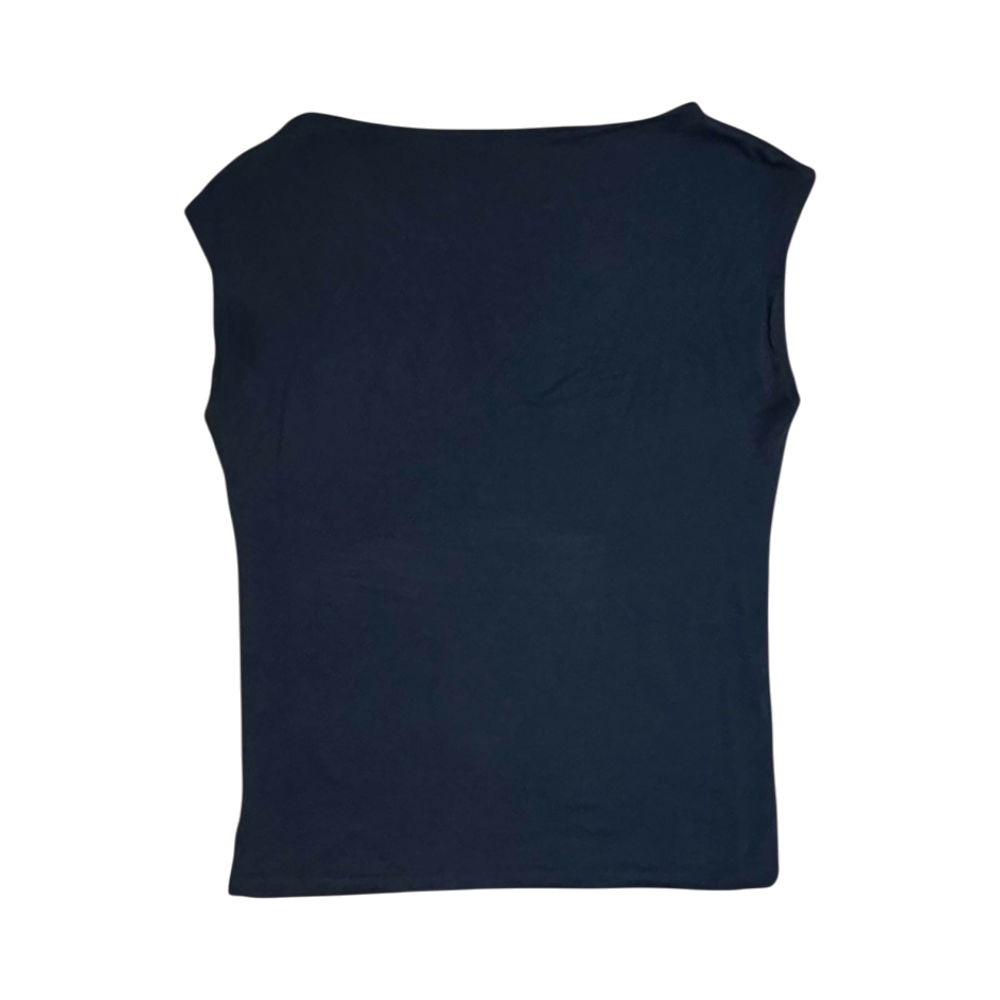 Simple navy drape-neck t-shirt, basic wardrobe staple.