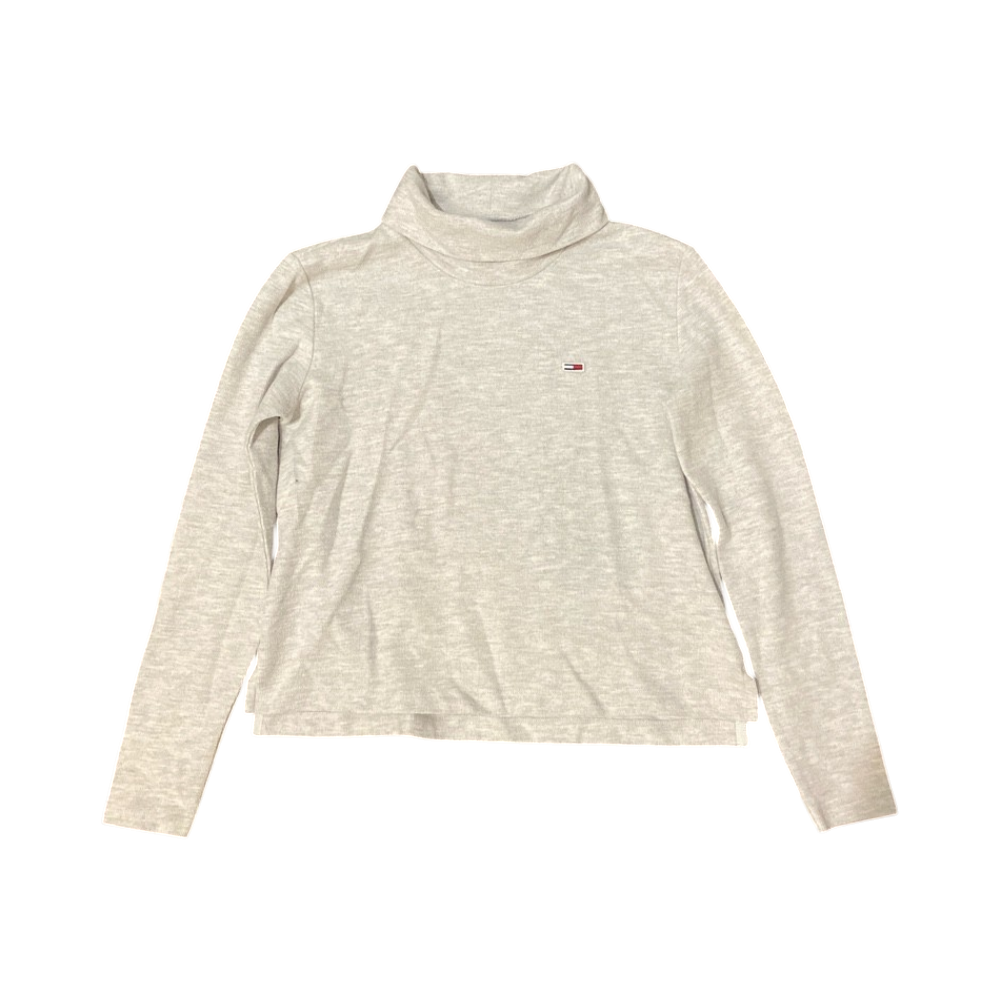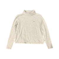 Vaaleanharmaa, pitkähihainen poolopaita, pienellä logolla.