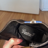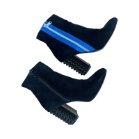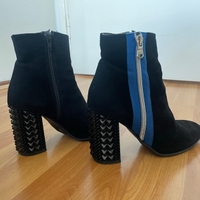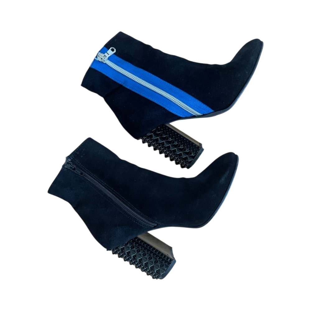 Studded block heel, side zippers and blue trim detail. Made in Italy.
