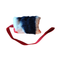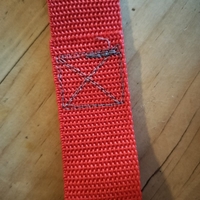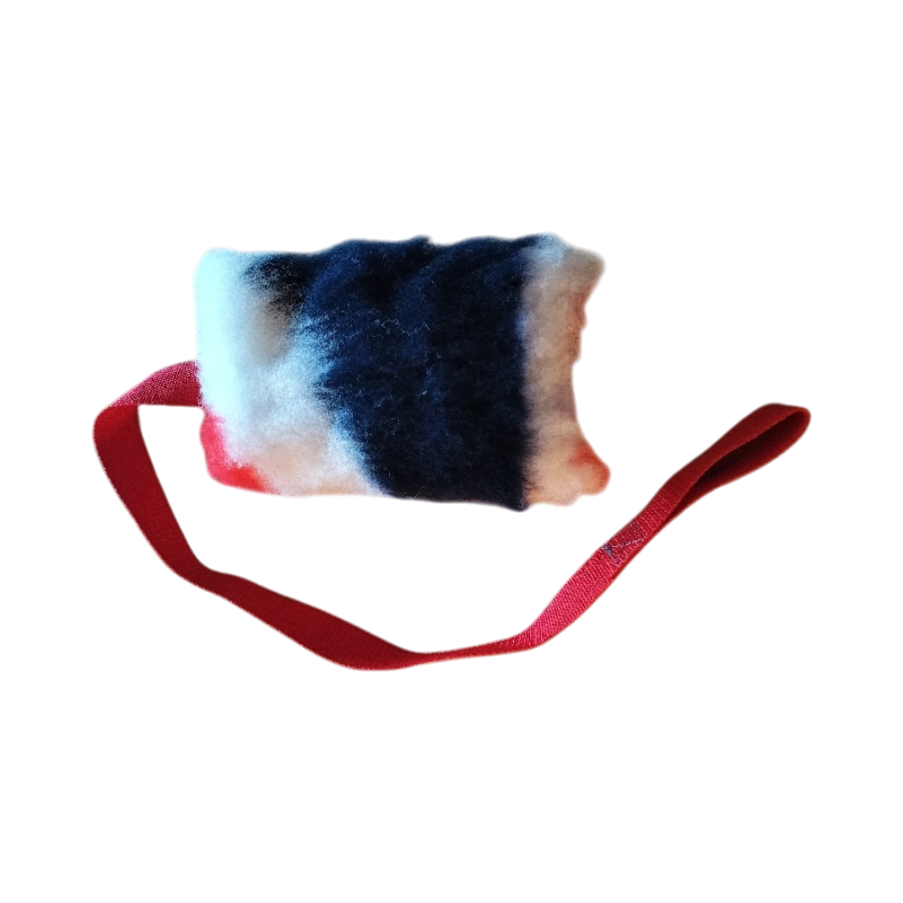 Täytetty pehmeä lelu, punainen nailonremmi kiinnitetty.