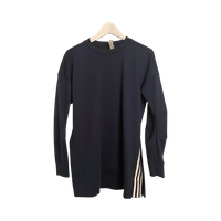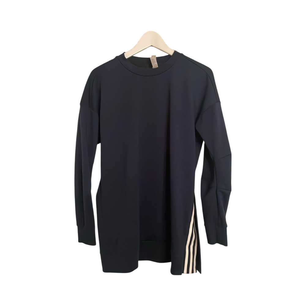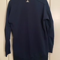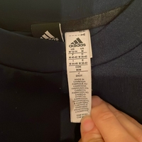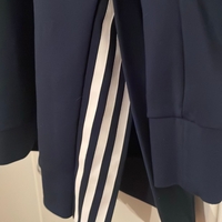 Pitkä mustansininen adidas-college, valkoisilla kolmen raidan yksityiskohdilla.