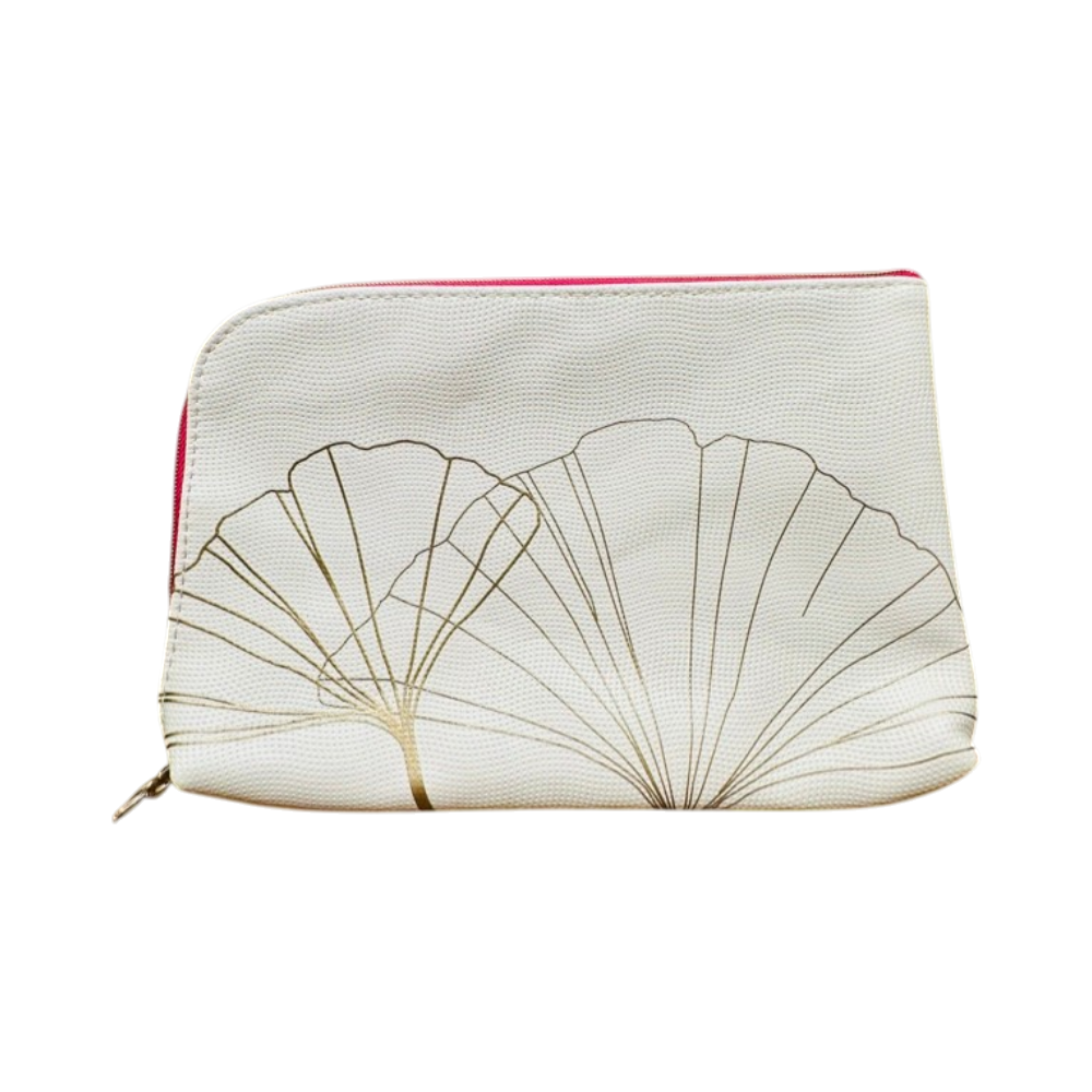 Meikkipussi, kultaiset lehtikuviot, vetoketjulla. Koko 20 x 14,5 cm.