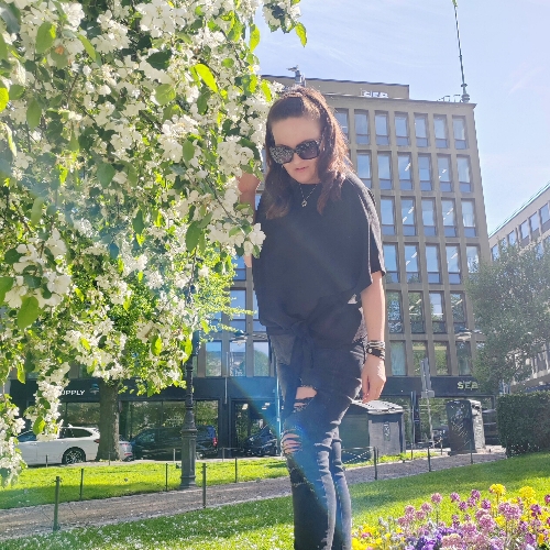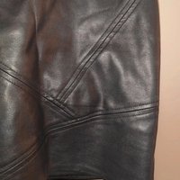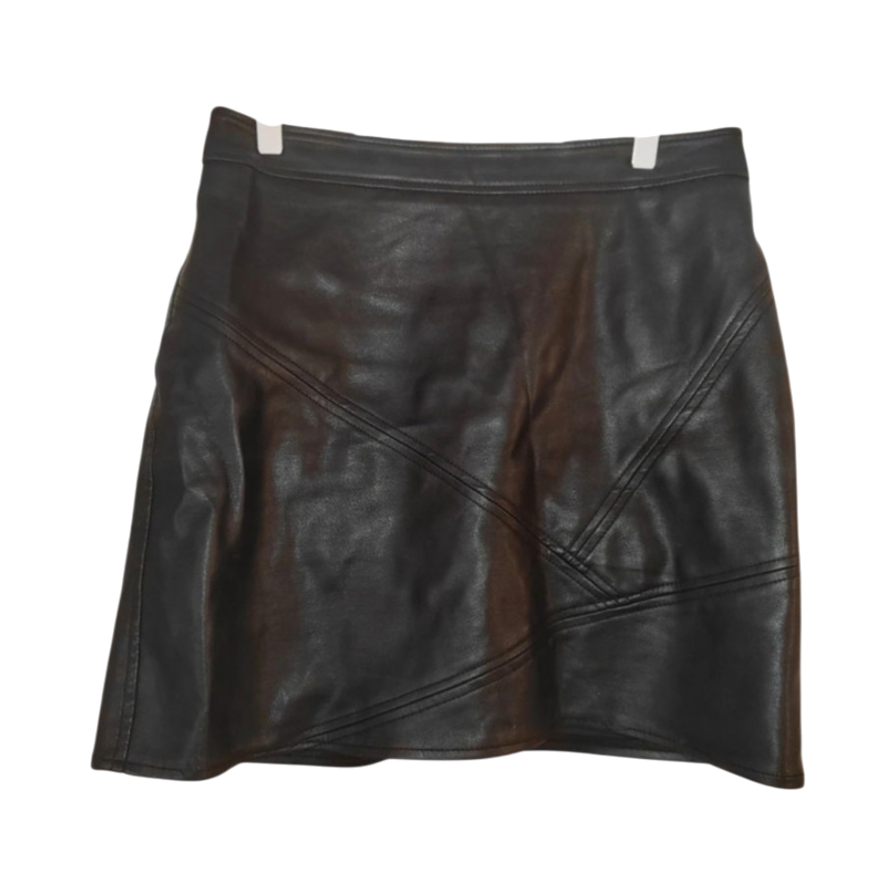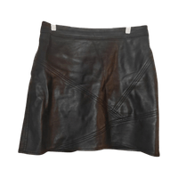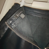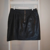Lyhyt musta nahkahame, vetoketjulla ja paneelisaumoilla.