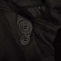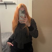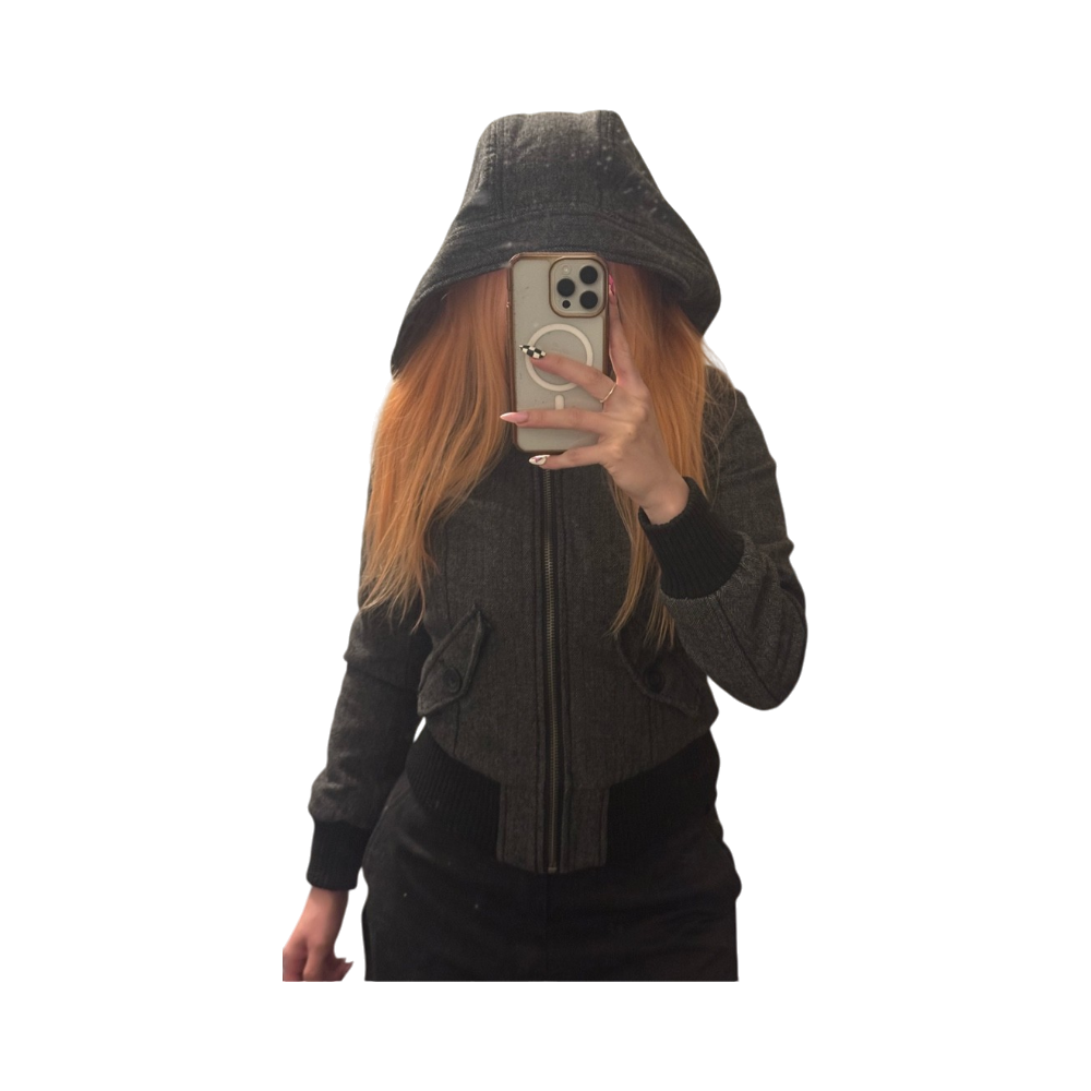 Lyhyt harmaa bomber-takki, vetoketjuilla ja resorilla helmassa. Itselle auttamatta liian kireä hartioista