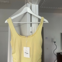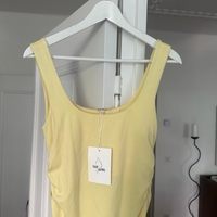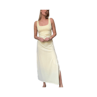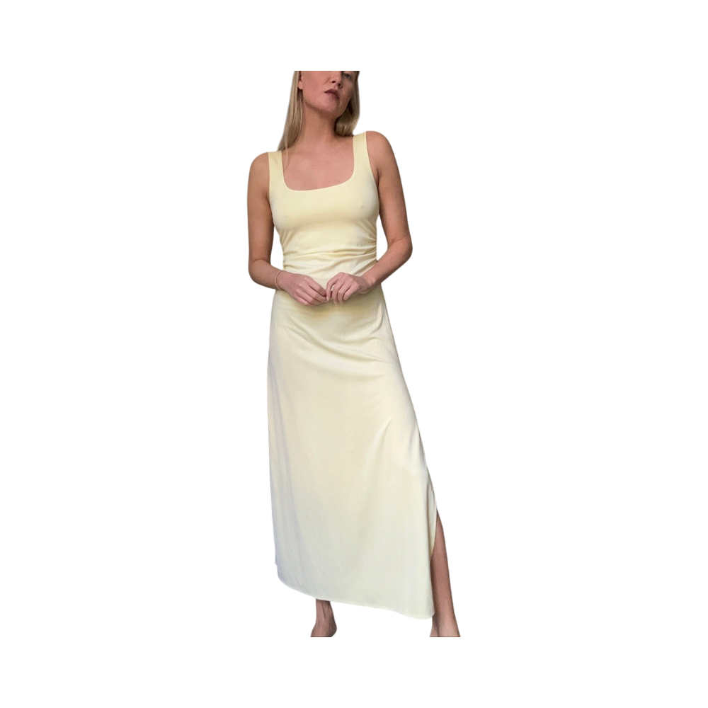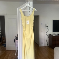 Keltainen, hihaton pitkähihainen mekko sivuhalkiolla.