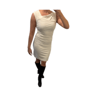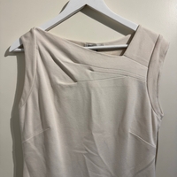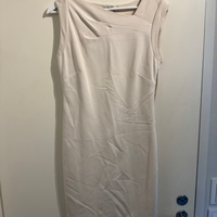Klassinen, helmapituinen mekko, siistit saumat ja olkapääyksityiskohta.