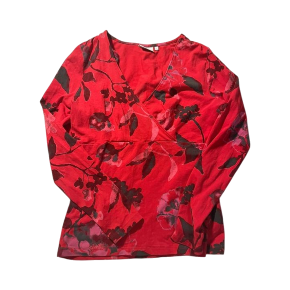 Long-sleeve red wrap-style top with floral print.