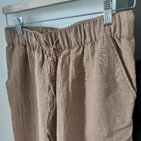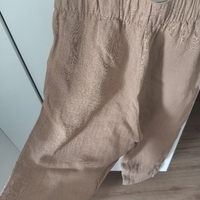 Beiget, rennot housut, joissa kiristysnyöri vyötäröllä. Puuvillasekoite