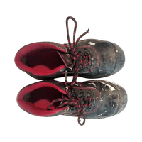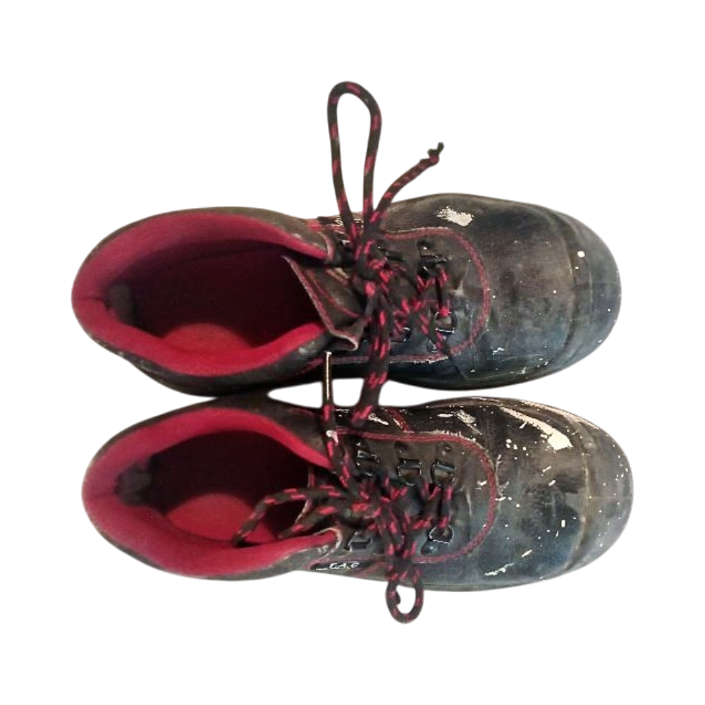 Kuluneet työkengät, maalitahroja, pitävä pohja.