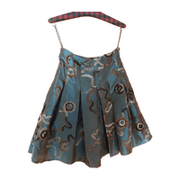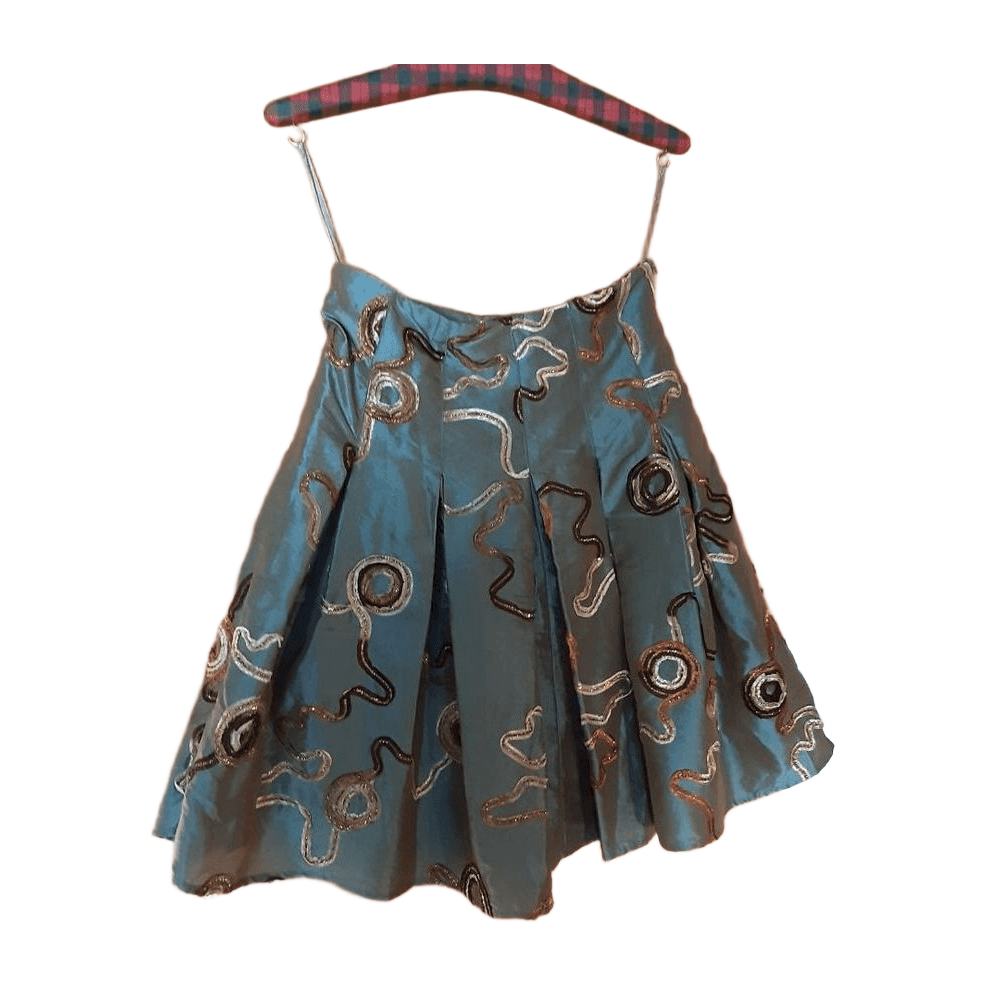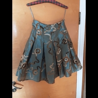Vekattu juhlahame. Kullan, ruskean ja keltaisin koristenauha kuvioin. 100 % polyesteri ja vuori asetaattia. Sivulla vetoketjukiinnitys. Uuden veroinen.