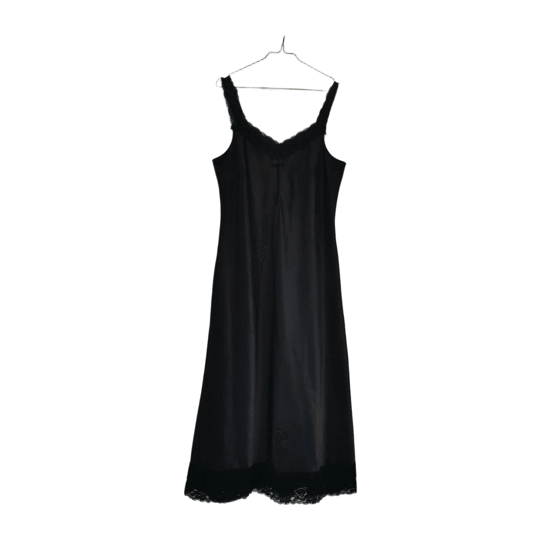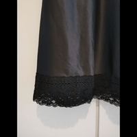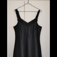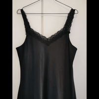 Pitkä satiini en alusmekko /yömekko. Kunto erittäin hyvä. Kokomerkintää ei ole mutta arvio noin M-L, kainalo-kainalo venyttämättä tasona 43 cm ja pituus pääntieltä edestä helmaan 105. Materiaali joustaa hyvin. Tosi mukava päällä. Leveät pitsiolkaimet ja edessä rusettikoriste.