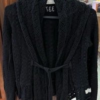 XS kokoinen musta neuletakki 100% puuvillaa, kaunista reikäpitsiä. Hieman haalistunut. Eläintalous. Hajusteeton pesuaine. Kainalo-kainalo mitta 45cm, olka-helma 51cm. Valmistajan kokomerkintä 0 vastaa kokoa XS, mutta sopii myös lyhyelle/lyhytselkäiselle S kokoa käyttävälle.