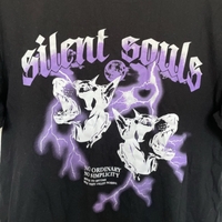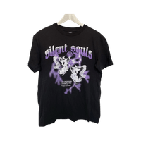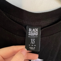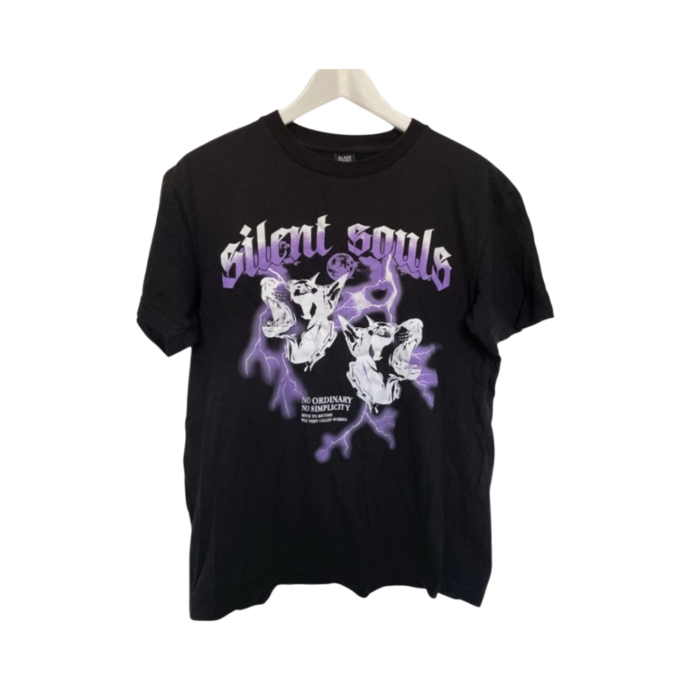 Mustapohjainen printtipaita violetilla kuviolla. Miesten puolelta ostettu joten on oversized. Koossa XS