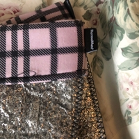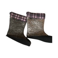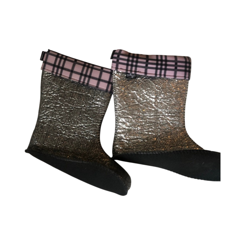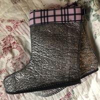 Silverinsäihkyvät, lämpimät sisä-/sadetossut, pinkillä ruudullisella resorilla.