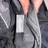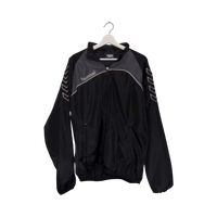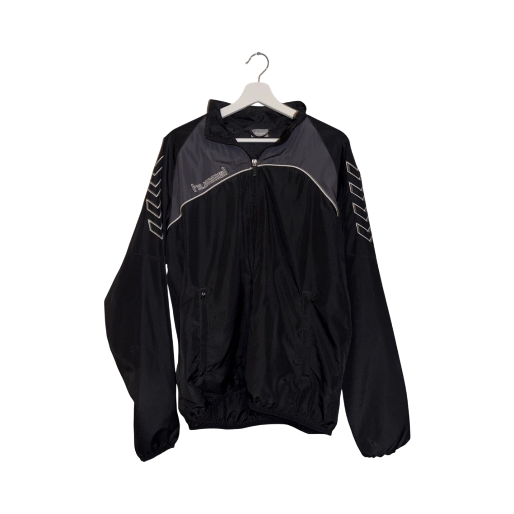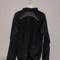 Kevyt, musta ja harmaalla tehosteella; vetoketjullinen tuulitakki.