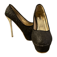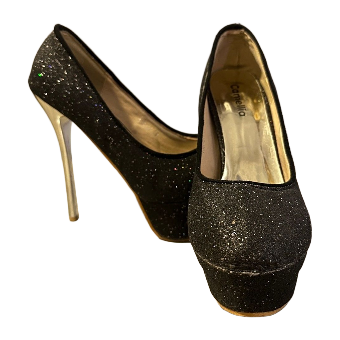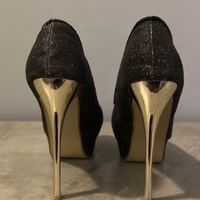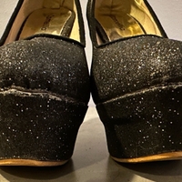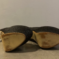 Korkeat kimallekorot,pohjissa kulumaa mutta korko kunnossa, liimaus on kulunut kenkien kärjestä mutta on korjattavissa ja on vielä platformissa kiinni, vähän käytetyt mutta käytönjälkiä löytyy. Koron korkeus 14cm, platformin 4cm.