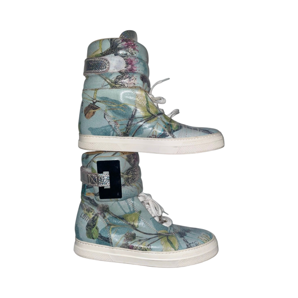 Korkeavartiset tennarit kukkakuviolla ja kiiltoa sisältävillä remmeillä.