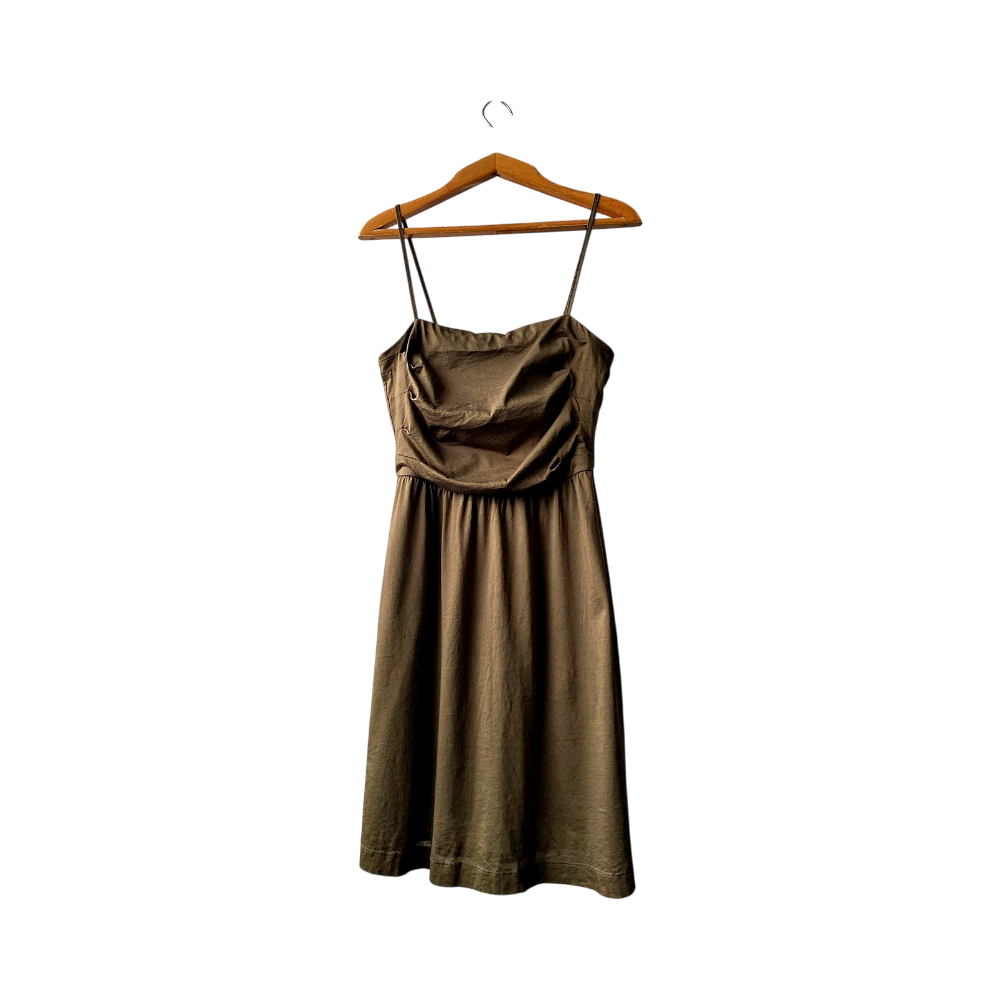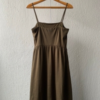 Khakinvihreä naruolkaiminen puuvillamekko. Koko L, mutta vastaa mielestäni paremmin m-kokoa. Kangas joustaa, mekossa alushame.