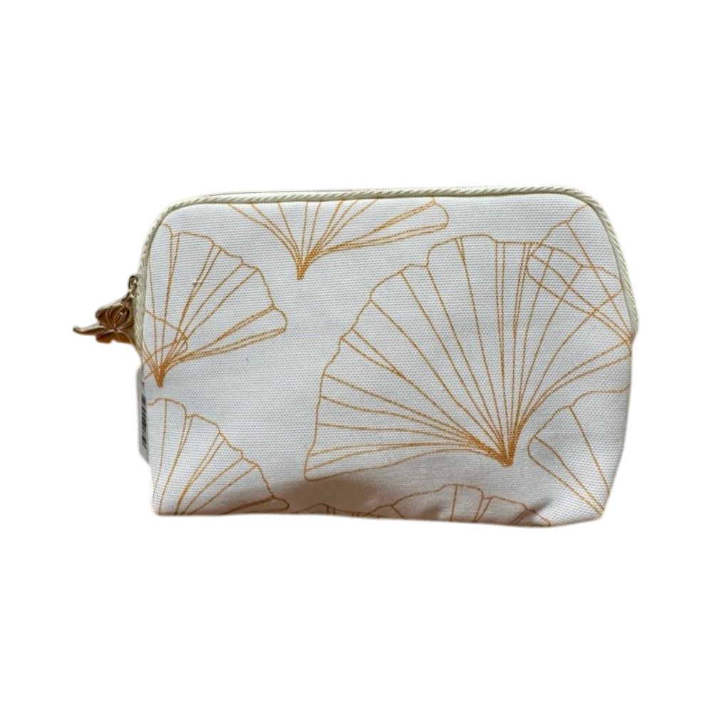 Valkoinen toilettilaukku kultaisin kuviolinjoin, vetoketjulla. Koko 20 x 14,5 cm.