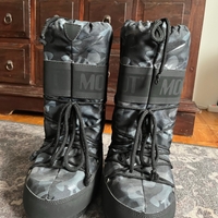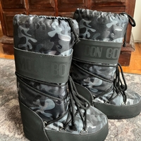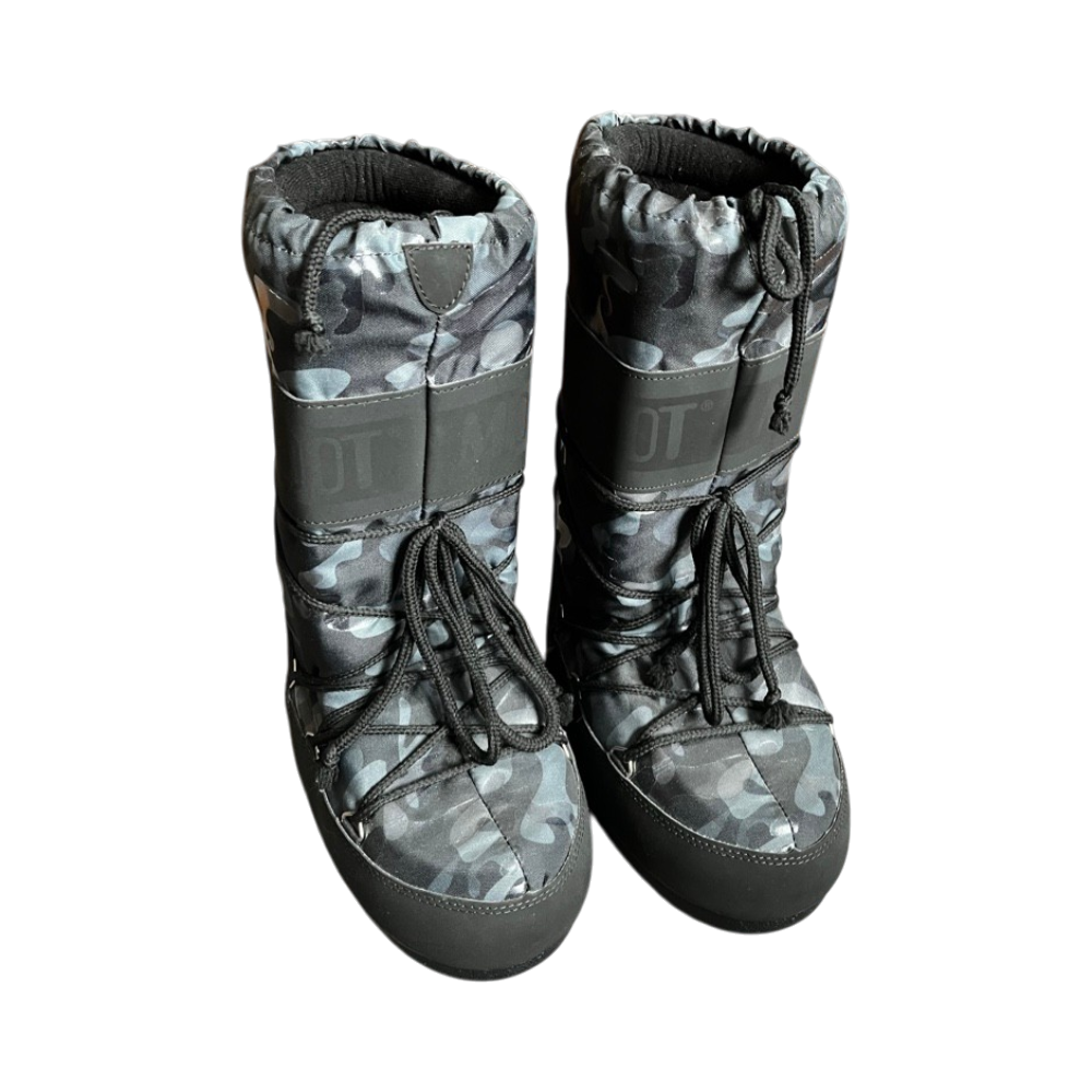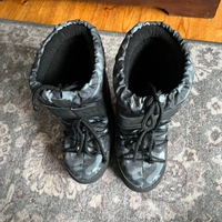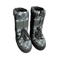 Insulated black and grey camo winter Moon Boots with lace-up front. These are almost brand new. I only tried them on once before I realised they are too small for my comfort. Size is 35-38 but I would say they fit more comfortably as 35-37.