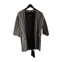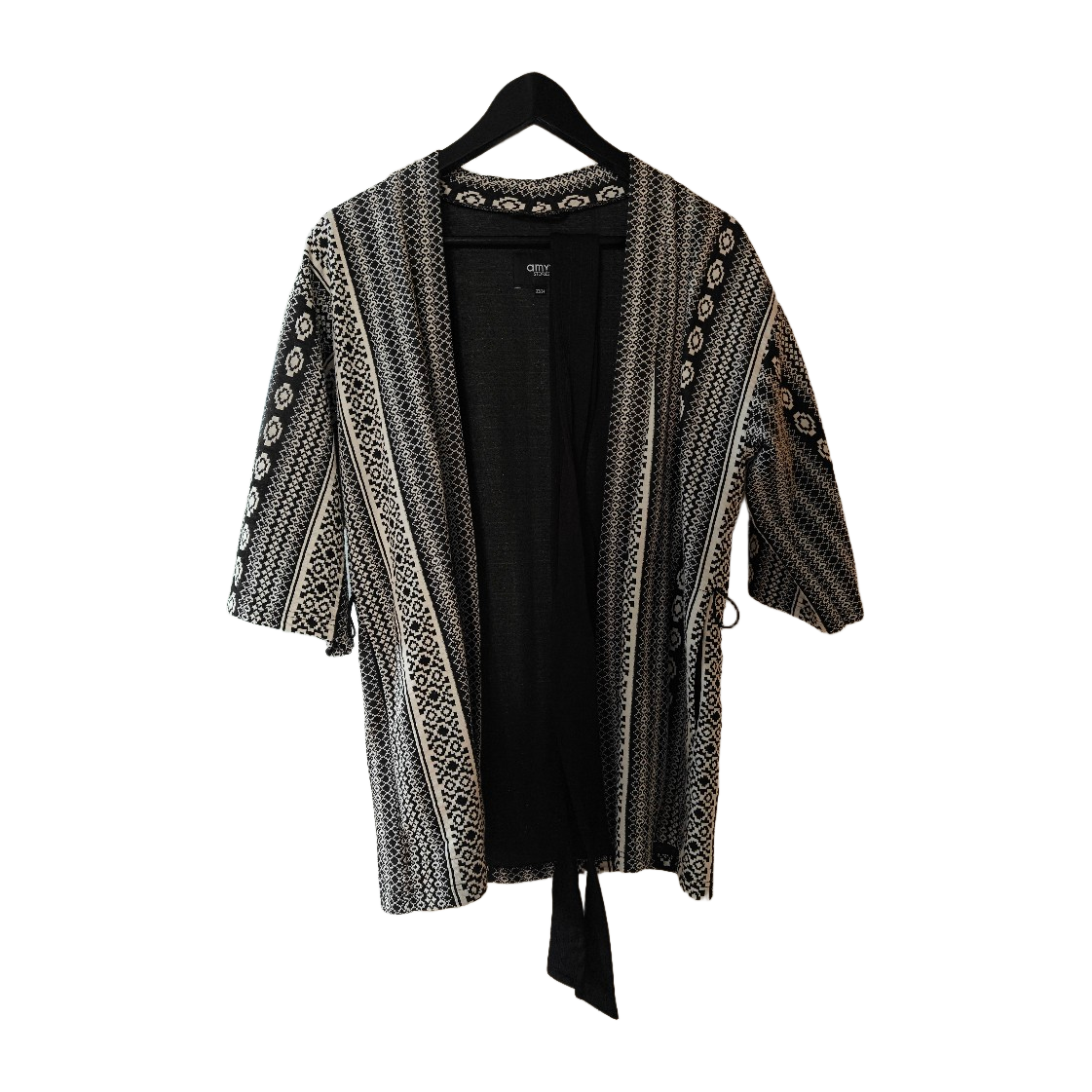 Amy's Stories -merkkinen kimonotyylinen neuletakki, kaunista etnistä kuviointia. Ei kiinnitystä, mutta mukana vyötärölle solmittava vyö/nauha. Kokolapun mukaan 32-34, mutta rento mitoitus, itselleni XS-S kokoa käyttävälle sopiva.