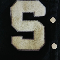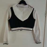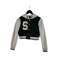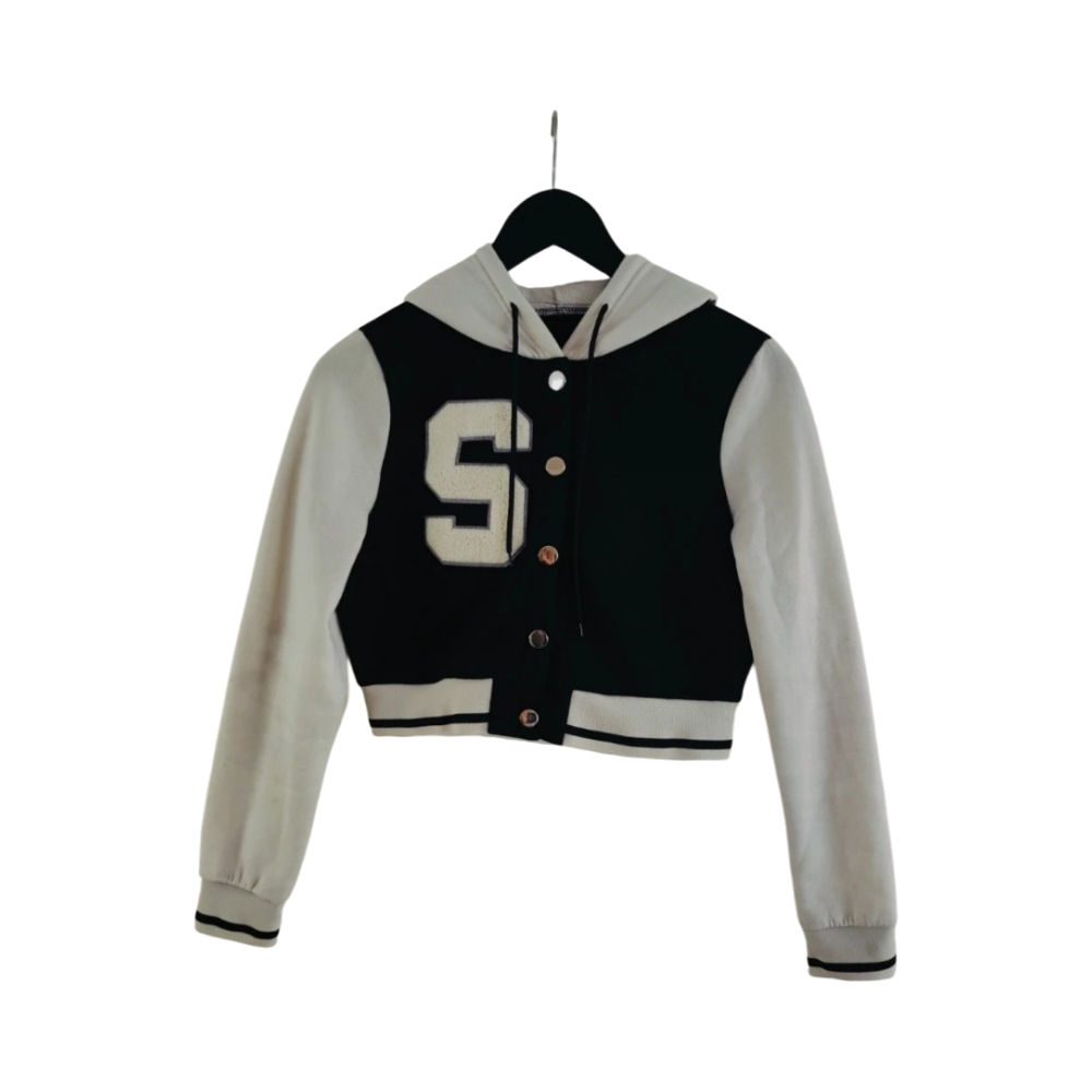 Lyhyt, kaksivärinen collegehuppari napituksella ja kirjailulla.