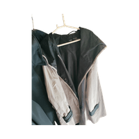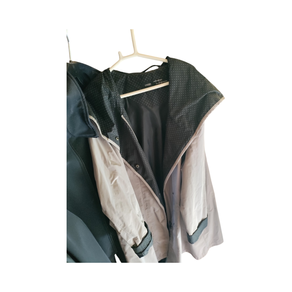 Kevyt sadetakki, käännettävä huppu ja napit edessä.
