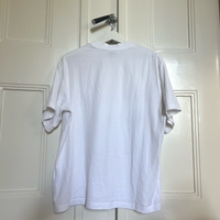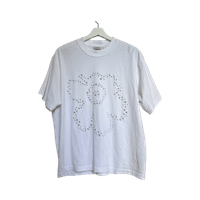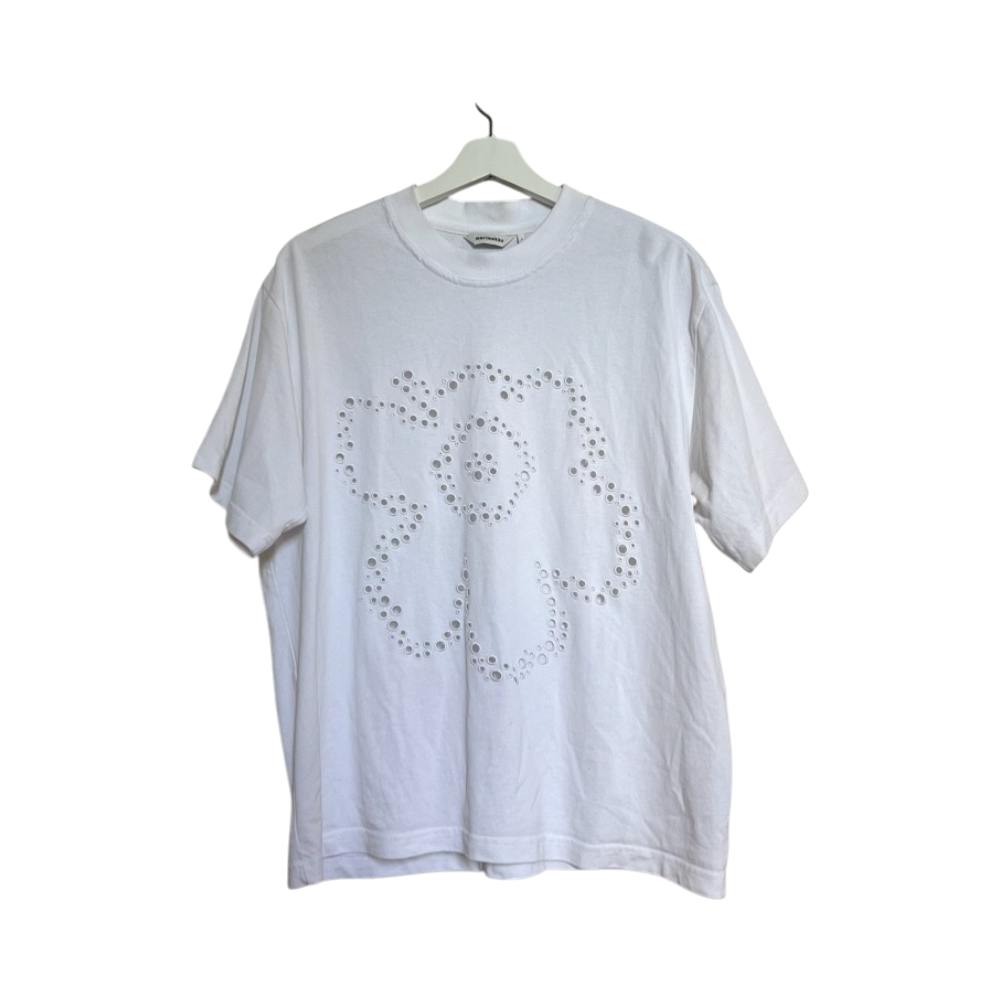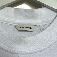 Valkoinen Unikko -kuvioitu puuvillat-paita, rei'ityskuvio edessä. Oversized malli, eli menee noin S-L koolle.