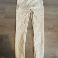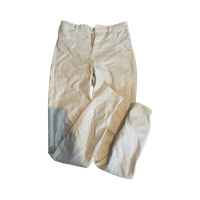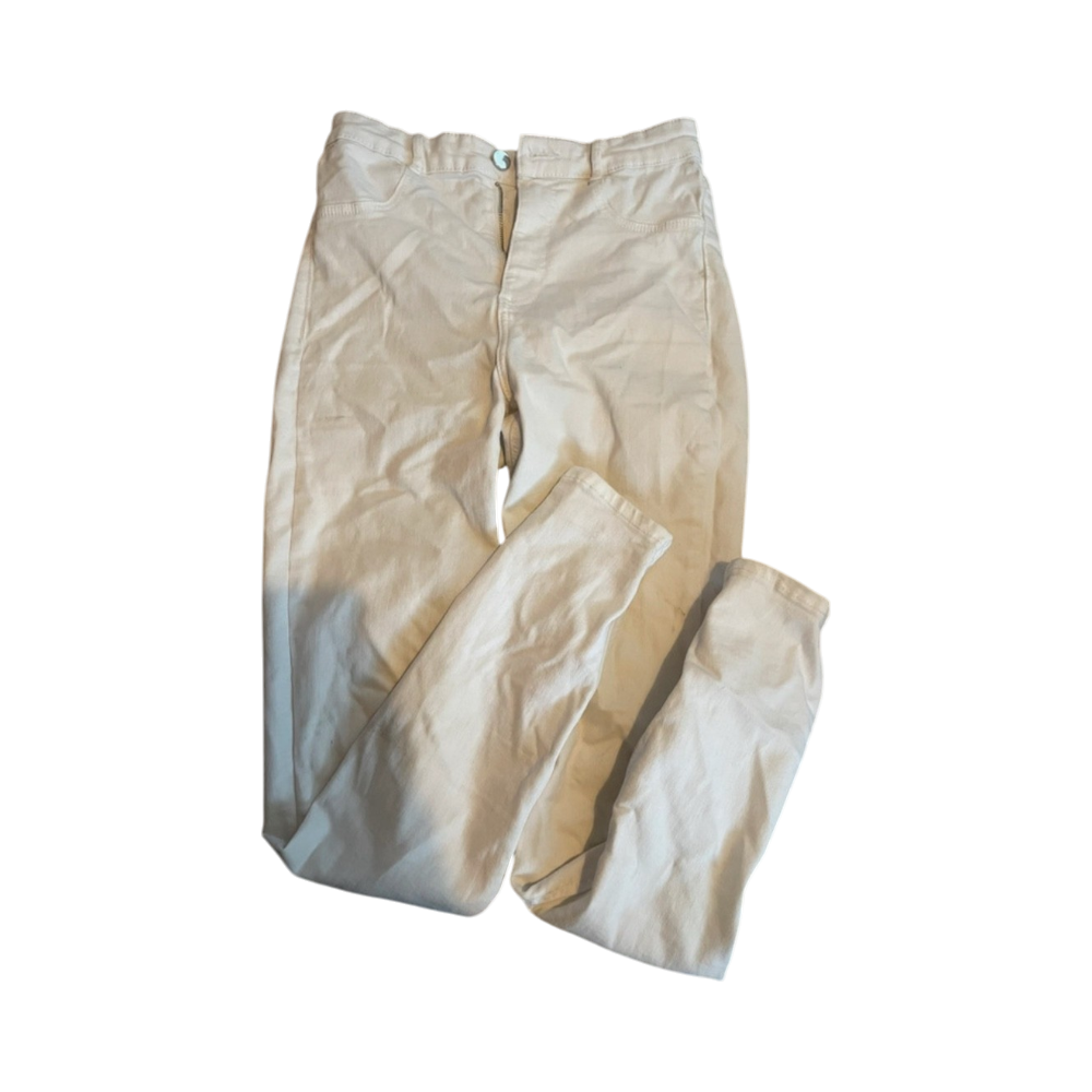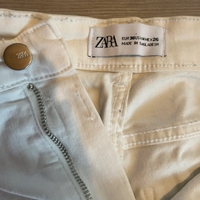 Slim high-waisted white jeans, five-pocket style, zip fly.
