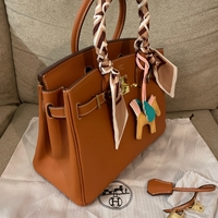 Hermès Birkin nahkainen naisten käsilaukku ruskeassa värissä. Laukussa on kullanväriset metalliosat ja mukana tulee lukko sekä avain. Käsilaukun kahvassa on huivi joka tulee mukaa, kaikki kuvassa näkyvä tulee mukaan. Soveltuu arkeen ja erityistilanteisiin. Laukku on uusi ja saatu lahjaksi. Osta tästä itsellesi tai läheisillesi täydellinen joululahja 🤗✨ Saa tarjota! Koko 30cm