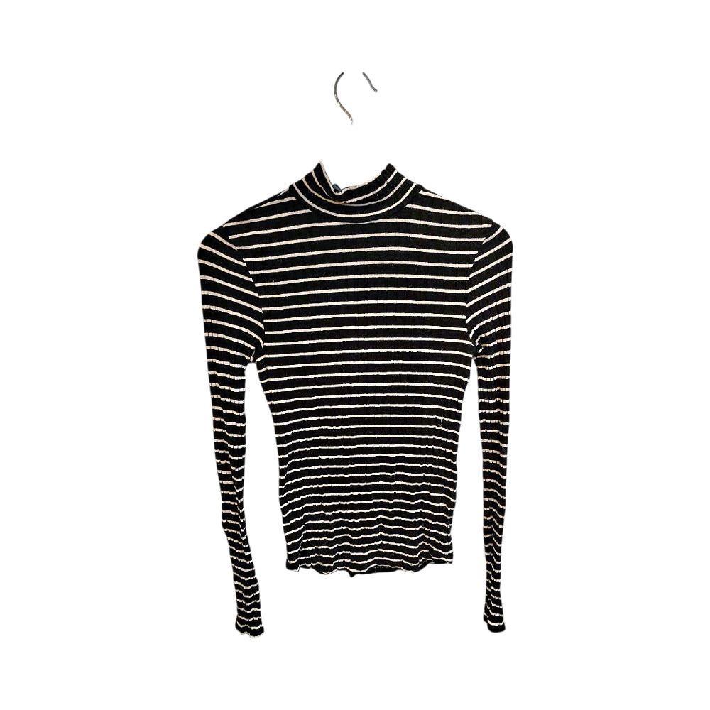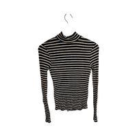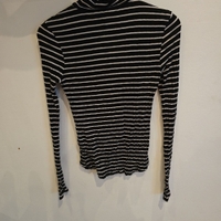 Ohut mustavalkoinen raidallinen pooloneule, joustavaa materiaalia.