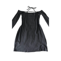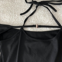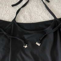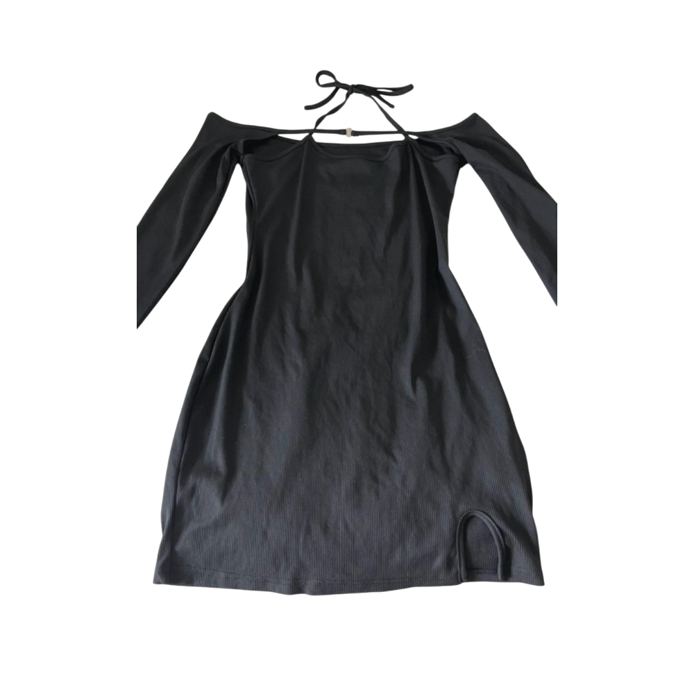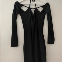 Musta mekko, jossa pieni halkio helmassa. Mekon narua, joka menee niskan takaa pystyy säätämään itselle sopivaksi ja eteen tulevat narut saa laitettua kiinni nipsukan avulla. Mekko on kokoa M. Mekkoa on käytetty vain pari kertaa.