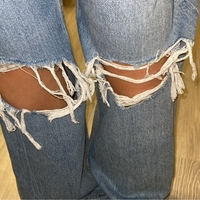 Suorat, repeytyksillä polvissa, rento istuvuus.