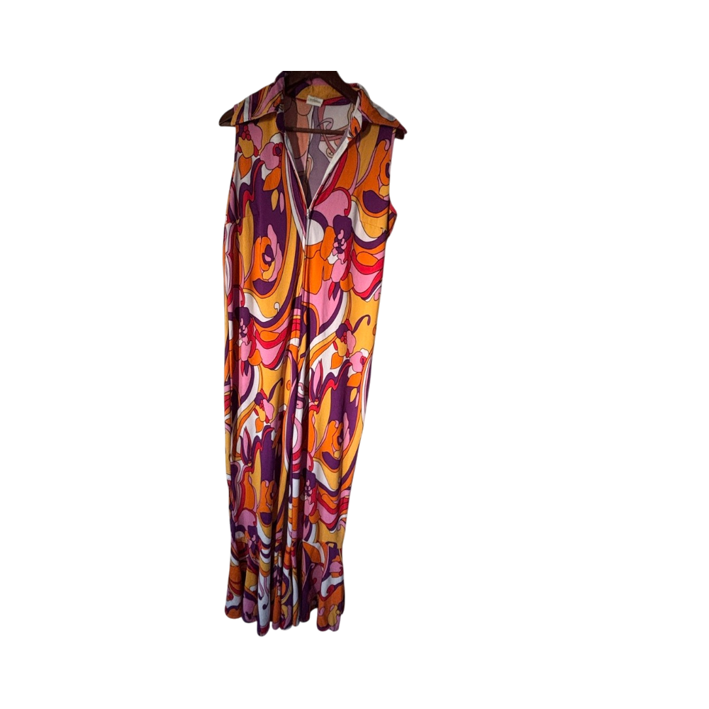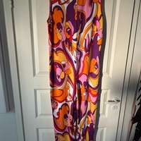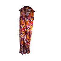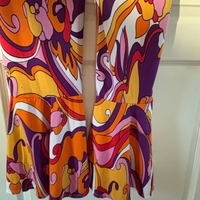 Värikäs retroprintti, leveä kaulus ja trumpettipuntit!