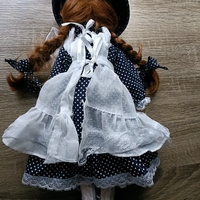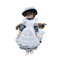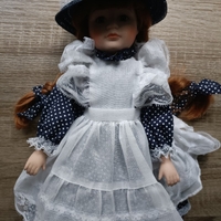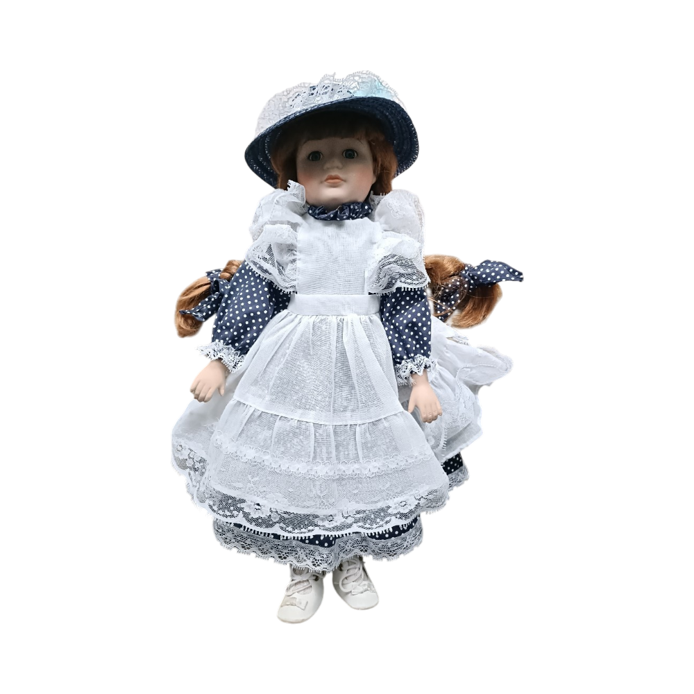 Posliininen keräilynukke pitsimekossa ja hatulla.