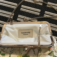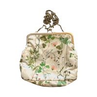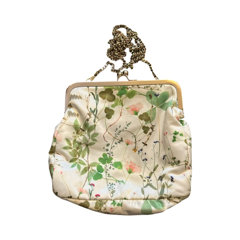 Pieni kukkakuvioinen laukku ketjuhihnalla, retrolukko.