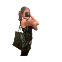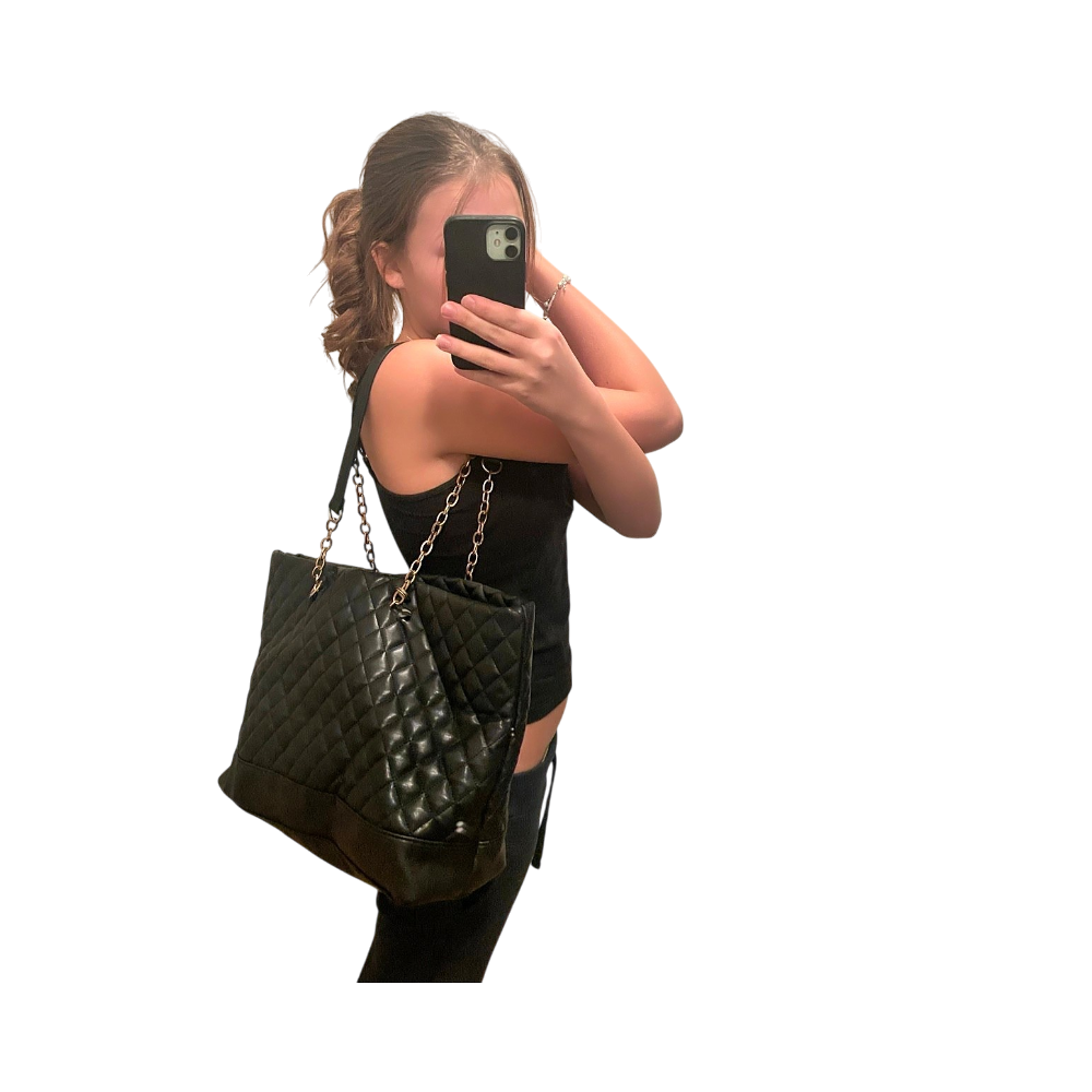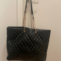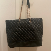 Tilava musta laukku kultaisilla ketjuhihnoilla, käytössä kulumaa.