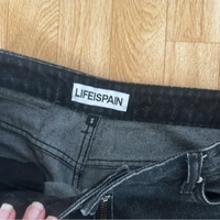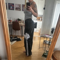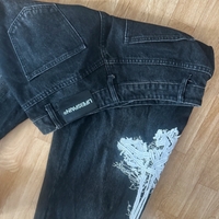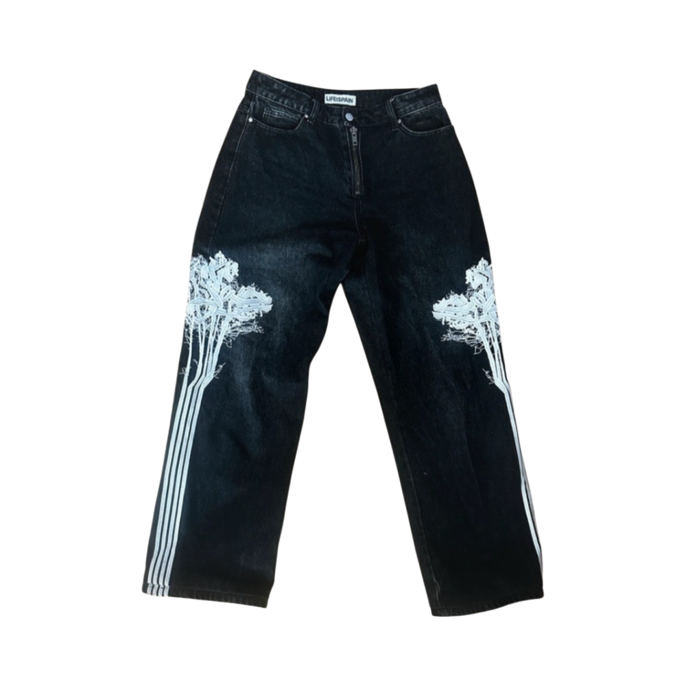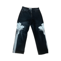 Exclusive german brand, made of recycled material. Low-waist grey/black jeans with white side stripes and tree prints.