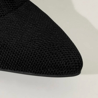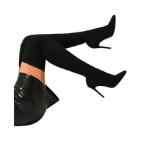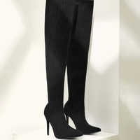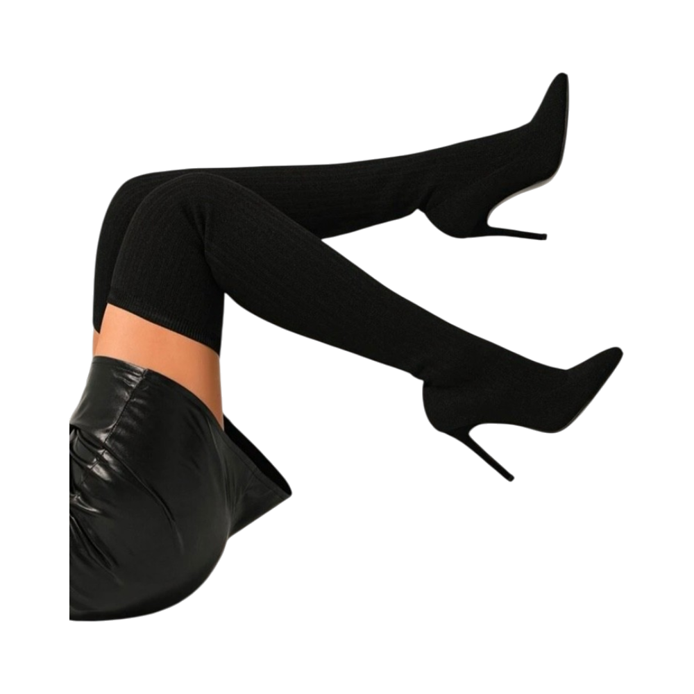 Black ribbed knit over-the-knee stiletto boots, pointed toe.
