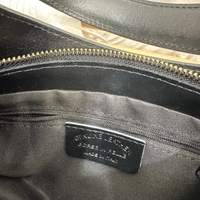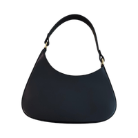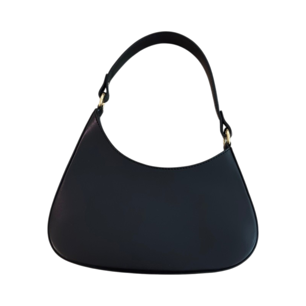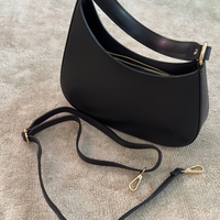 Mustaa sileää nahkaa, irrotettava pitkä hihna, kullanväriset yksityiskohdat. Merkkin on ruotsalainen LaTalia.