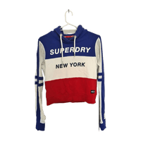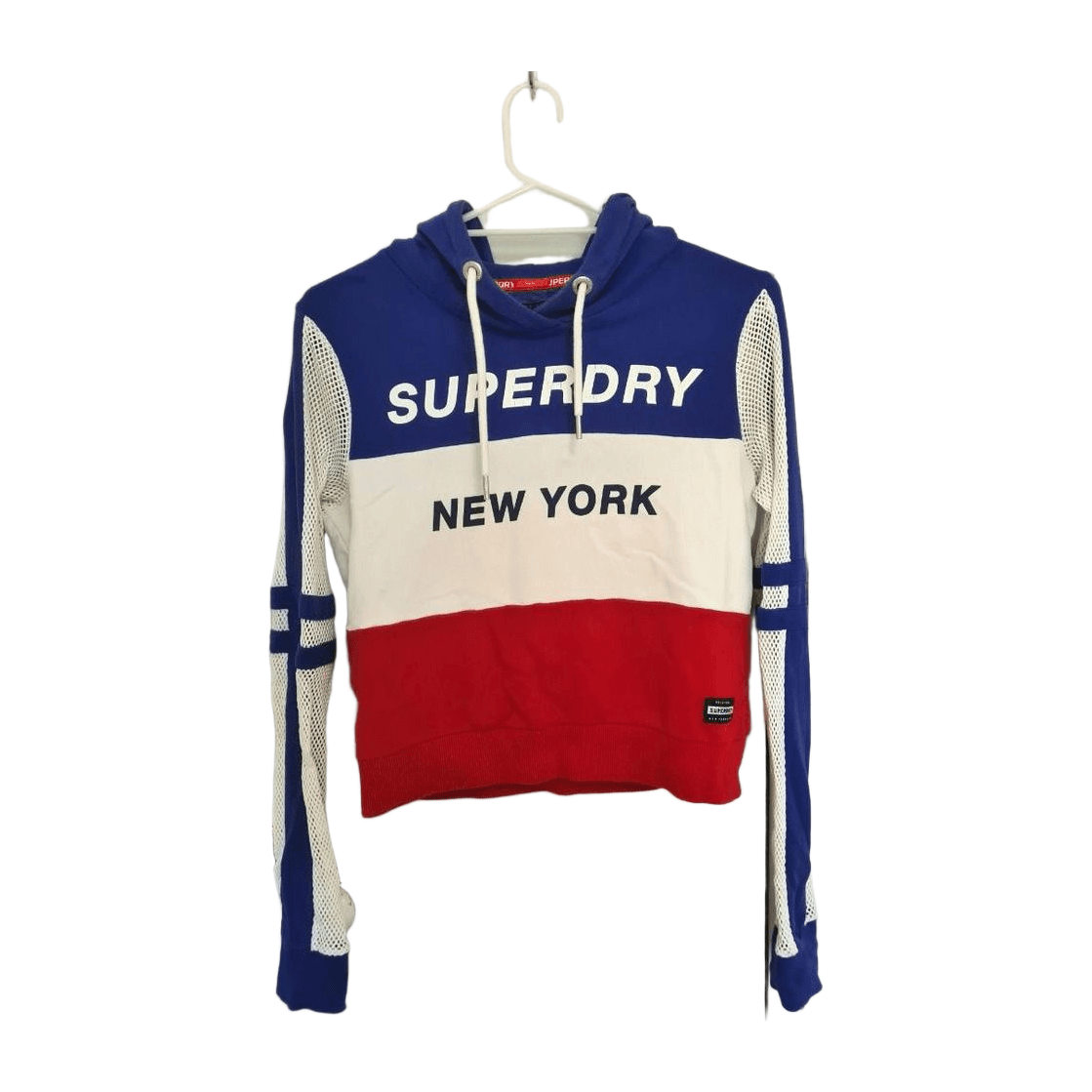 Superdry huppari. Hihojen alaosa verkkomateriaalia. Koko S, mutta varsinkin hihoista tiukahko, joten sopii myös XS kokoiselle. Käytön jälkiä löytyy ja sinisissä osissa havaittavissa pientä haalistumaa.