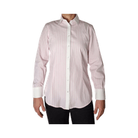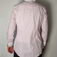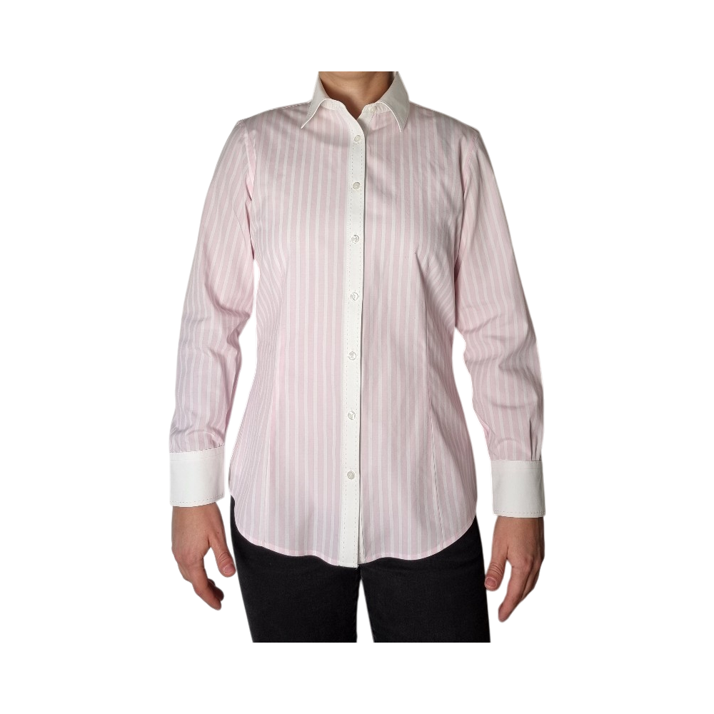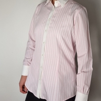 Kauniit vaaleanpunaiset ja valkoiset raidat sekä hienostunut vaaleanpunainen tikkaus napituksen vieressä tekevät paidasta elegantin.