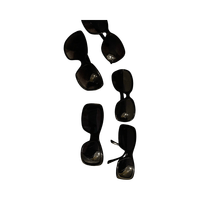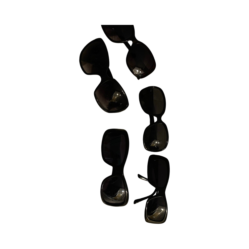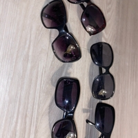 Kolme paria mustia aurinkolaseja, käytettyjä kunto vaihtelee.