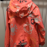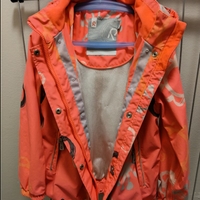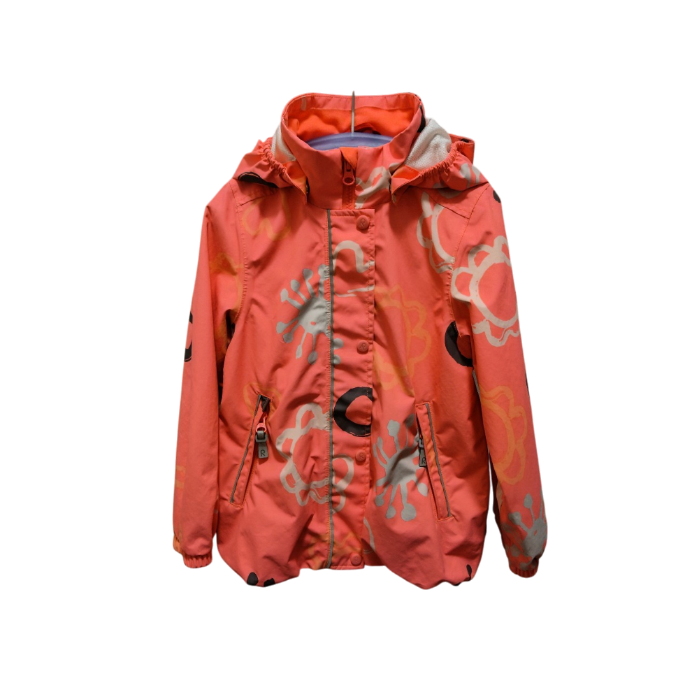 Iloisen värikäs ReimaTec-takki kokoa 116 (reilu mitoitus). Kaunis koralli väri ei näy täydellisesti kuvissa, myös tummemmat kuviot eivät livenä hyppää silmille kuten kuvissa. Erittäin hyväkuntoinen, myös värikkäät somisteet kuten nepparit, vetimet ja olkamerkki hyvässä kunnossa.
